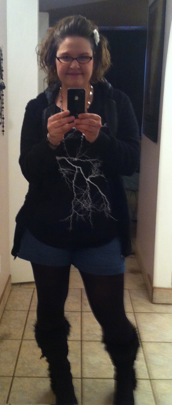 Photo taken with my new iPhone! Hoodie from eBay, boots Overstock.com, top Wal-Mart, shorts Goodwill and necklace Lia Sophia.